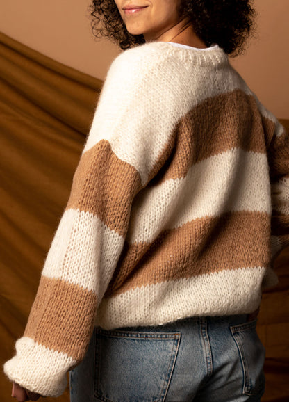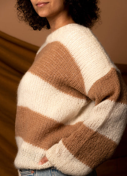 This wooly wonder is an easy knitting project. Our Pull Lula is flat knitted with three strands using stockinette stitch. It's the kind of timeless striped sweater you can curl up in almost everyday. Breathe in, headphones on, pull out your knitting needles and enjoy your personal space.